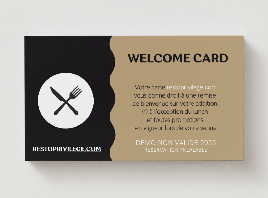 - Offre de bienvenue. Pour les inciter à découvrir votre table, nous offrons un avantage exclusif de bienvenue sous la forme d’une carte Restoprivilege personnalisée.